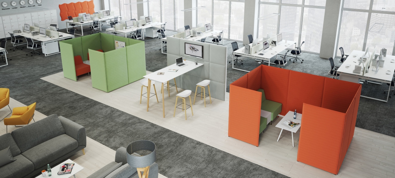 Acoustic screens are system solution for efficient acoustics management in a modern office working environment. There are two options of acoustics screens available: freestanding and desk screens fixed to the desktop. Screens in both options are fully upholstered. Acoustics screens system allows to easily arrange the space of the whole office. Freestanding screens are an ideal solution for separating workstations, building mobile meeting zones or separating quite zones from regular workstations. Desk screens visually divide workstations and ensure acoustic comfort at workstations.   FREE-STANDING ACOUSTIC SCREENS Free-standing acoustic screens system allows for a free office space arrangement. The free-standing screens can separate work space from common areas in the Open Space plan and isolate workstations that require focus or rest areas. The acoustic screens are designed to ensure best performance by isolating potential sound sources and absorbing sound waves with a special damping layer to achieve acoustic comfort for users. The Free-standing acoustic screens are also decorative elements which aesthetics is consistent with the whole FURNIKO product range. Screens system is based on fully upholstered modules 123 or 143 cm high. Construction and materials allow to use pins. Each module of the screen is fitted with two level regulators and zippers: one male and one female which allows for quick and easy straight joining of the modules. For joining the screens in L shapes, T shapes or X shapes an extra zipper is required which is an optional accessory. The acoustic screens can also stand as a separate module thanks to an optional stabilizing foot. The stabilizing foot is an optional accessory and it is available in two options: powder painted or chrome.   DESK SCREENS Desk screens are fully upholstered. They minimize distraction at work place and allow employees to communicate freely at the same time. The system of desk screens is based on panels fitted to desk tops with metal powder painted fixes. Desk screens are available in two height options: 41,5 or 30 cm above desk top. Height of 41,5 cm ensures acoustic comfort and separates the workstation visually. Height of 30 cm above the desk top separates the workstation visually and allows free communication at the same time. Construction and materials allow to pin objects to the desk screens. There are two types of fixes: for single tops and double tops.