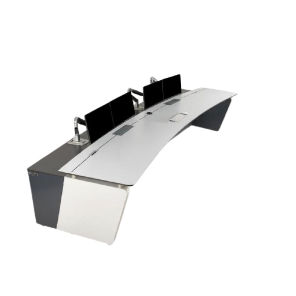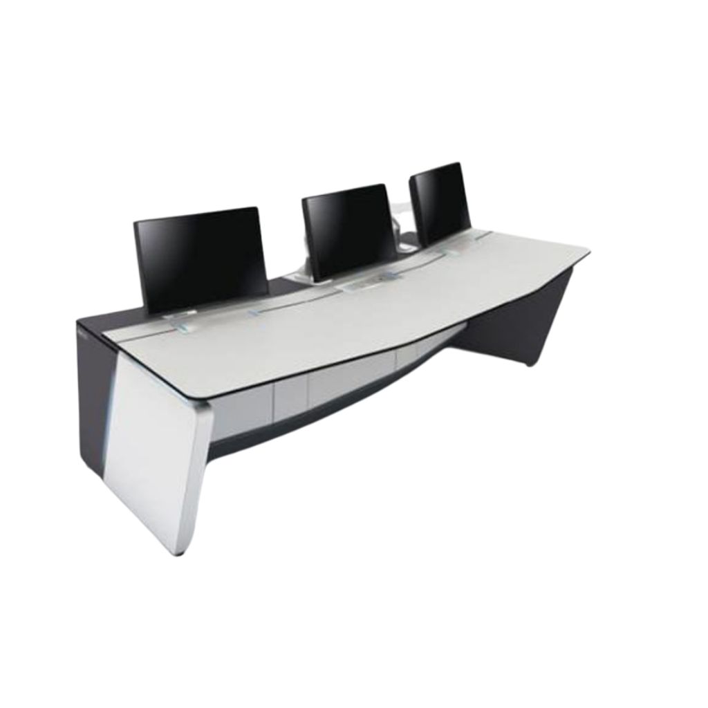 Curved control tables designed to suit a wide variety of control room configurations and operational setups.