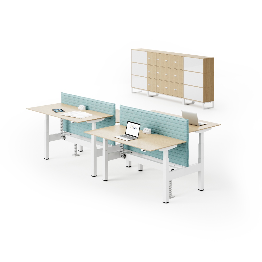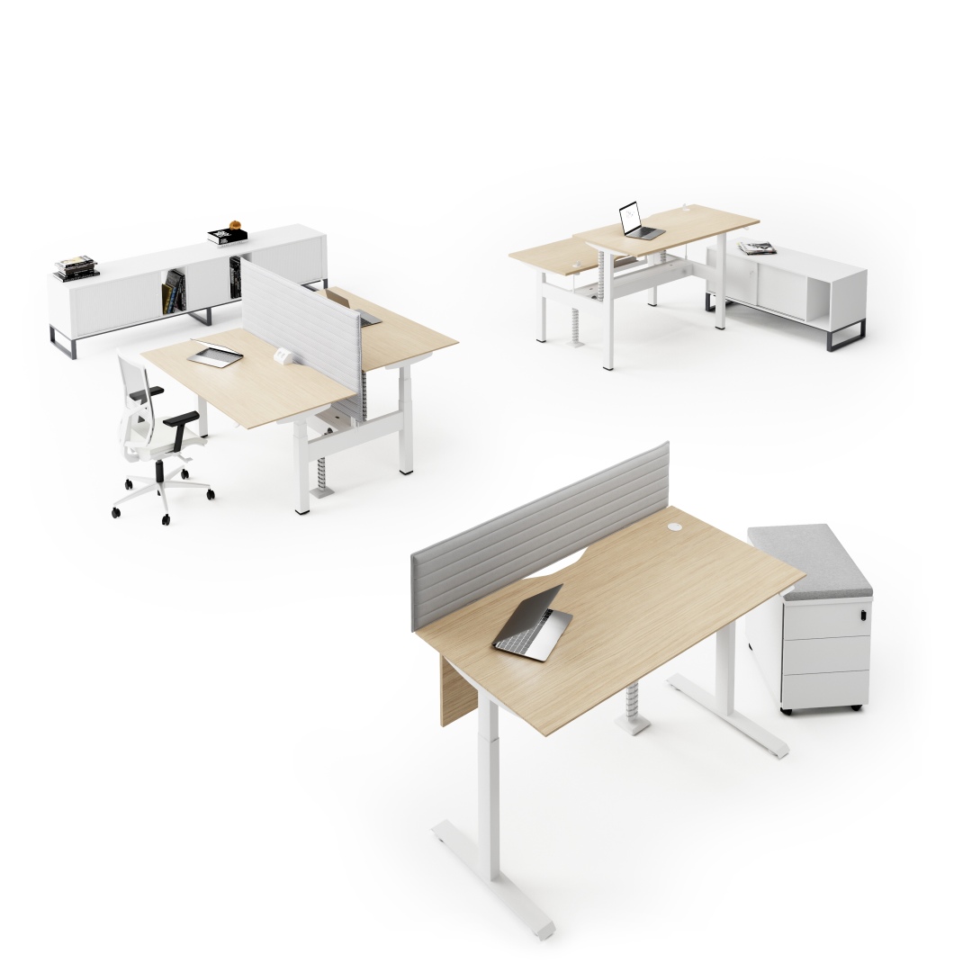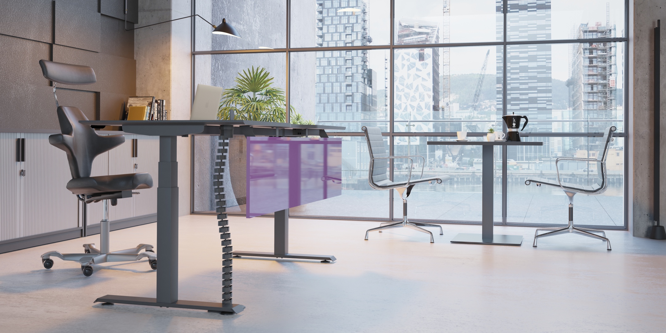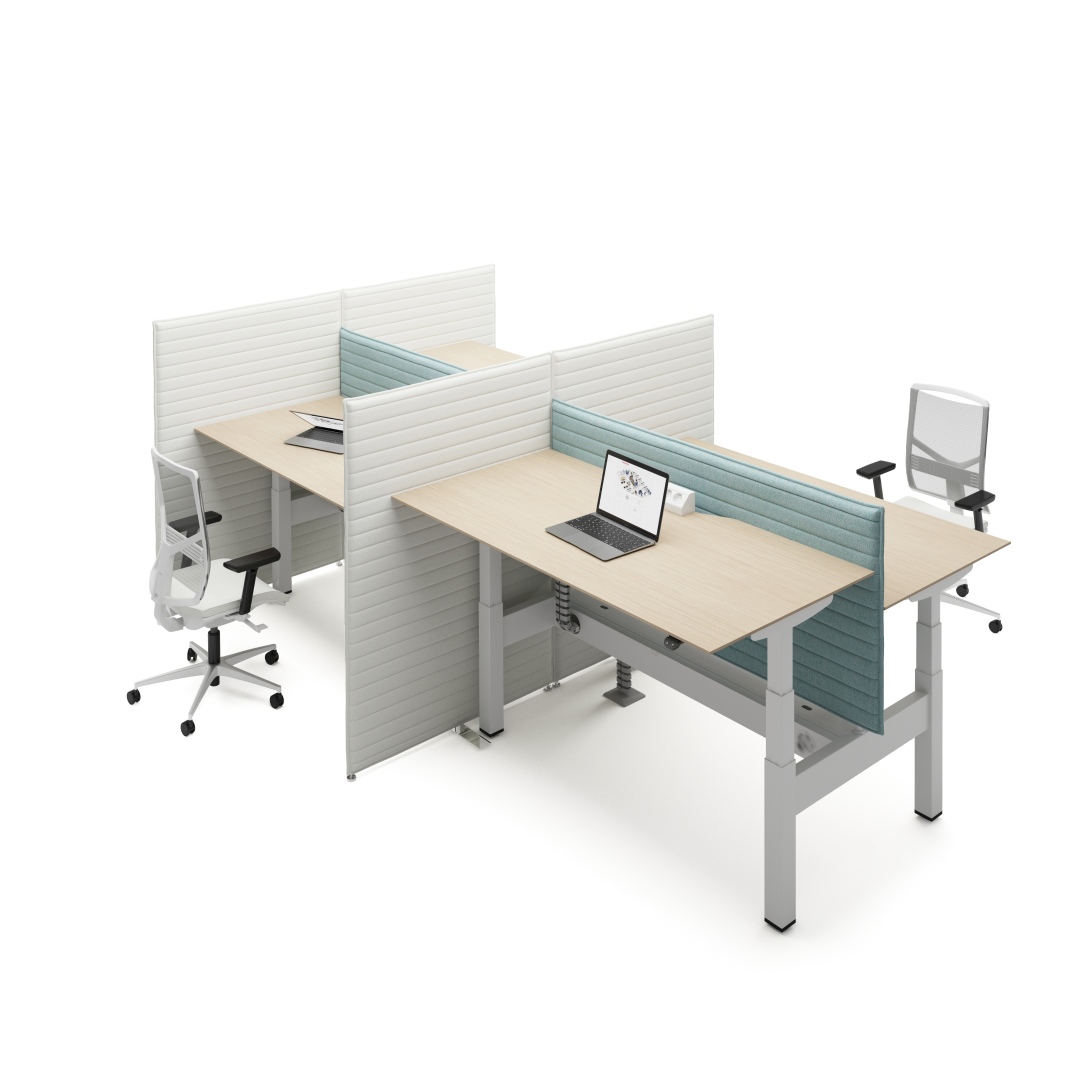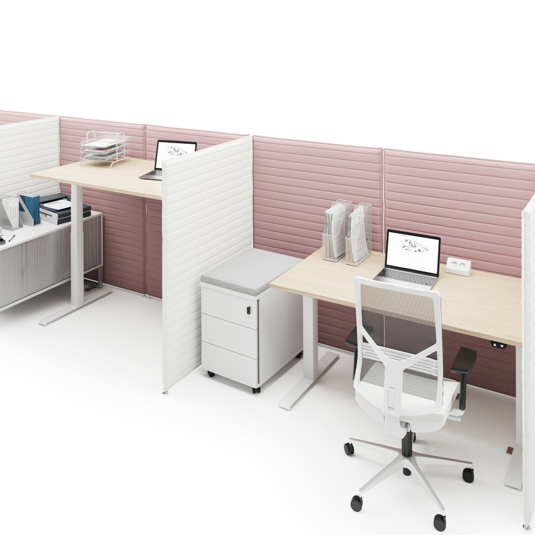 LIFT is a system of ergonomic desks with electrical hight regulation. We can choose among single desks or double desks called DUO. Both types of desks are eqipped with a metal cable tray mounted under the desk top as standard. DUO desks are also equipped with an ergonomic central cable tray. LIFT system is supplemented with acoustic screens, media ports and cable management solutions.