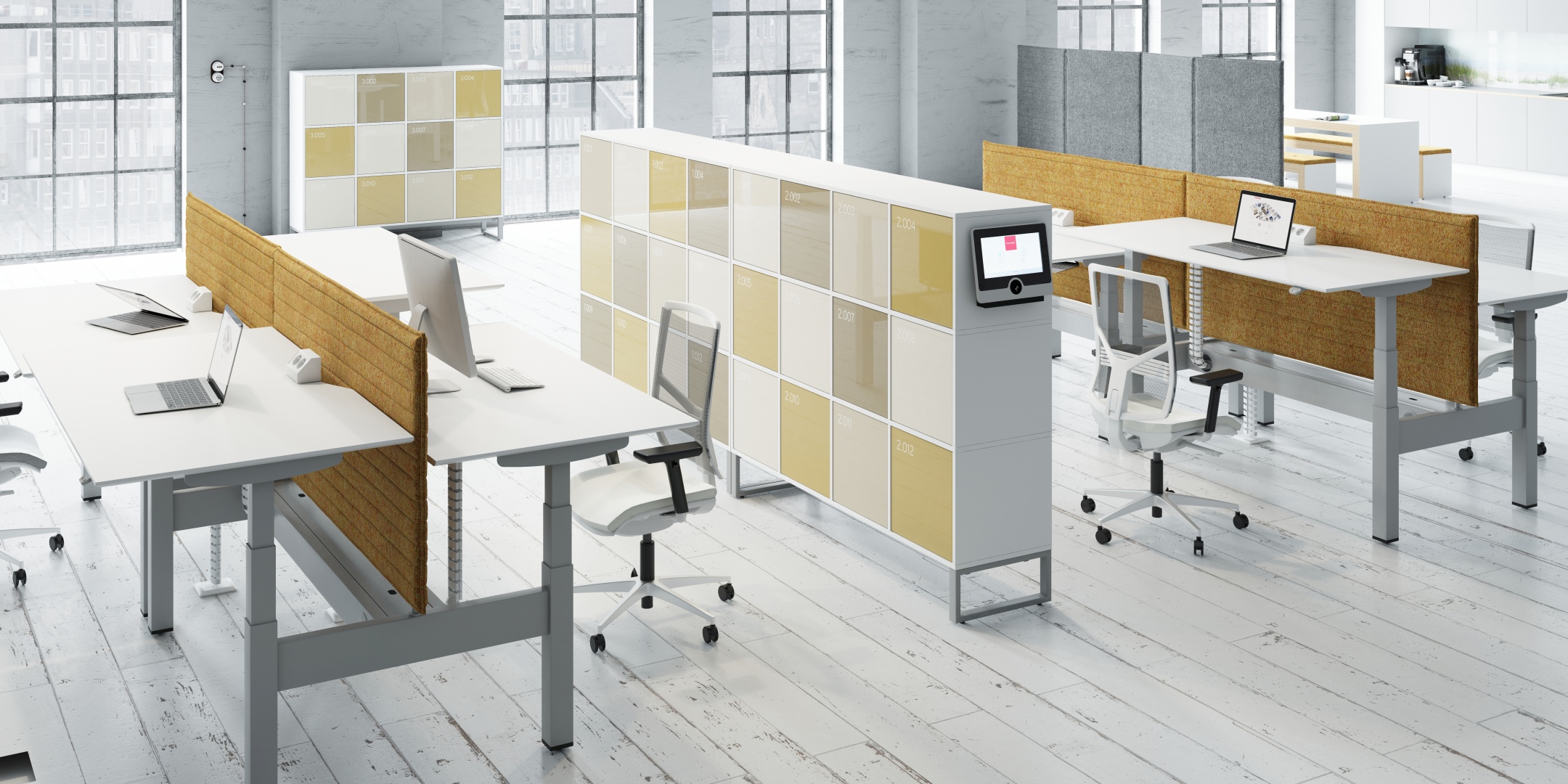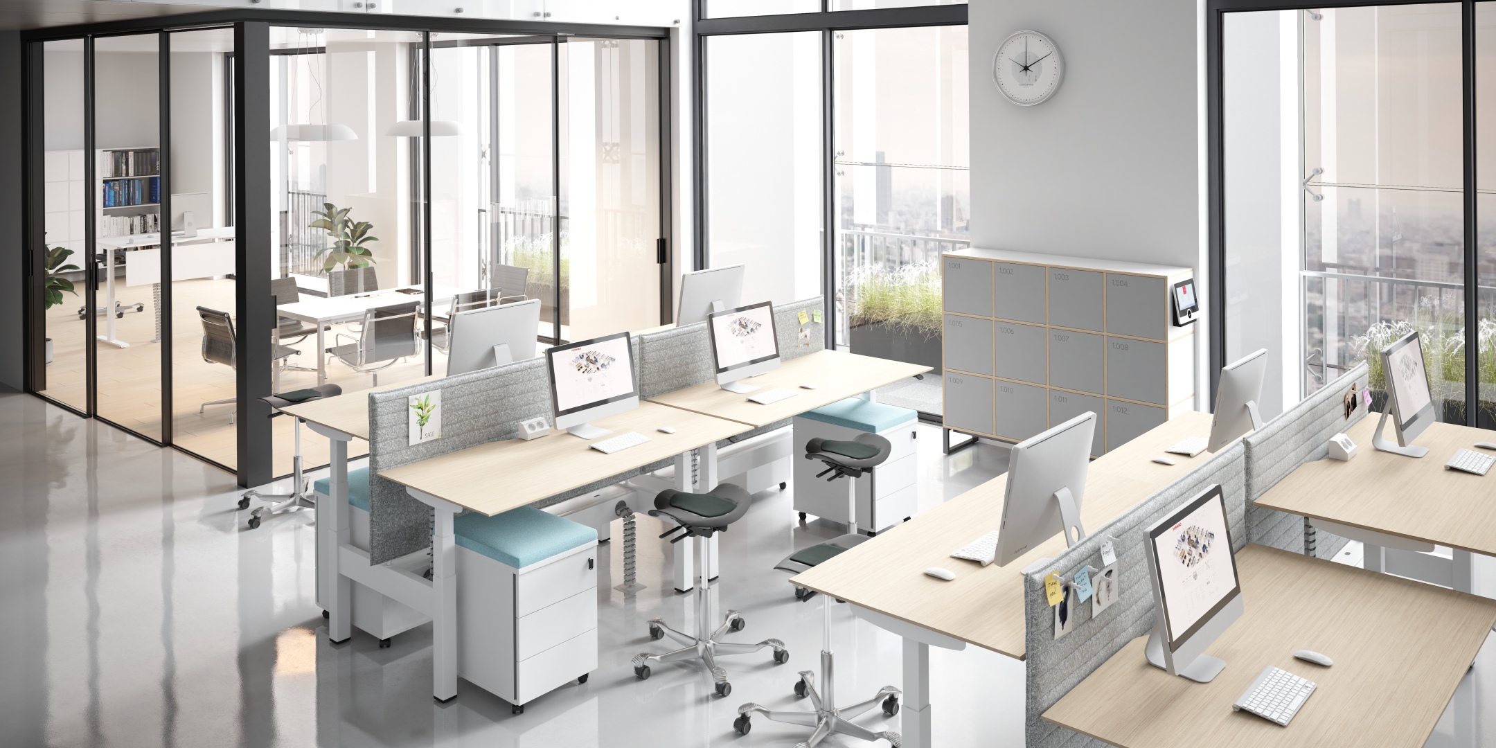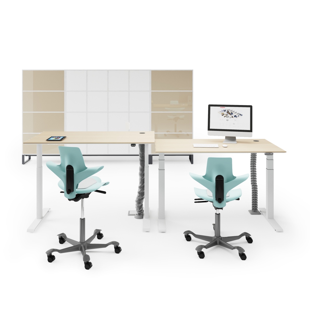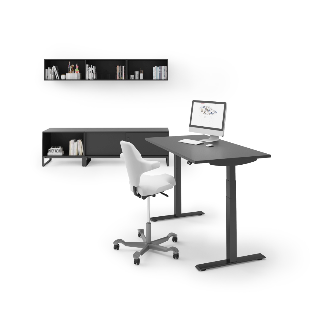 LIFT is a system of ergonomic desks with electrical hight regulation. We can choose among single desks or double desks called DUO. Both types of desks are eqipped with a metal cable tray mounted under the desk top as standard. DUO desks are also equipped with an ergonomic central cable tray. LIFT system is supplemented with acoustic screens, media ports and cable management solutions.