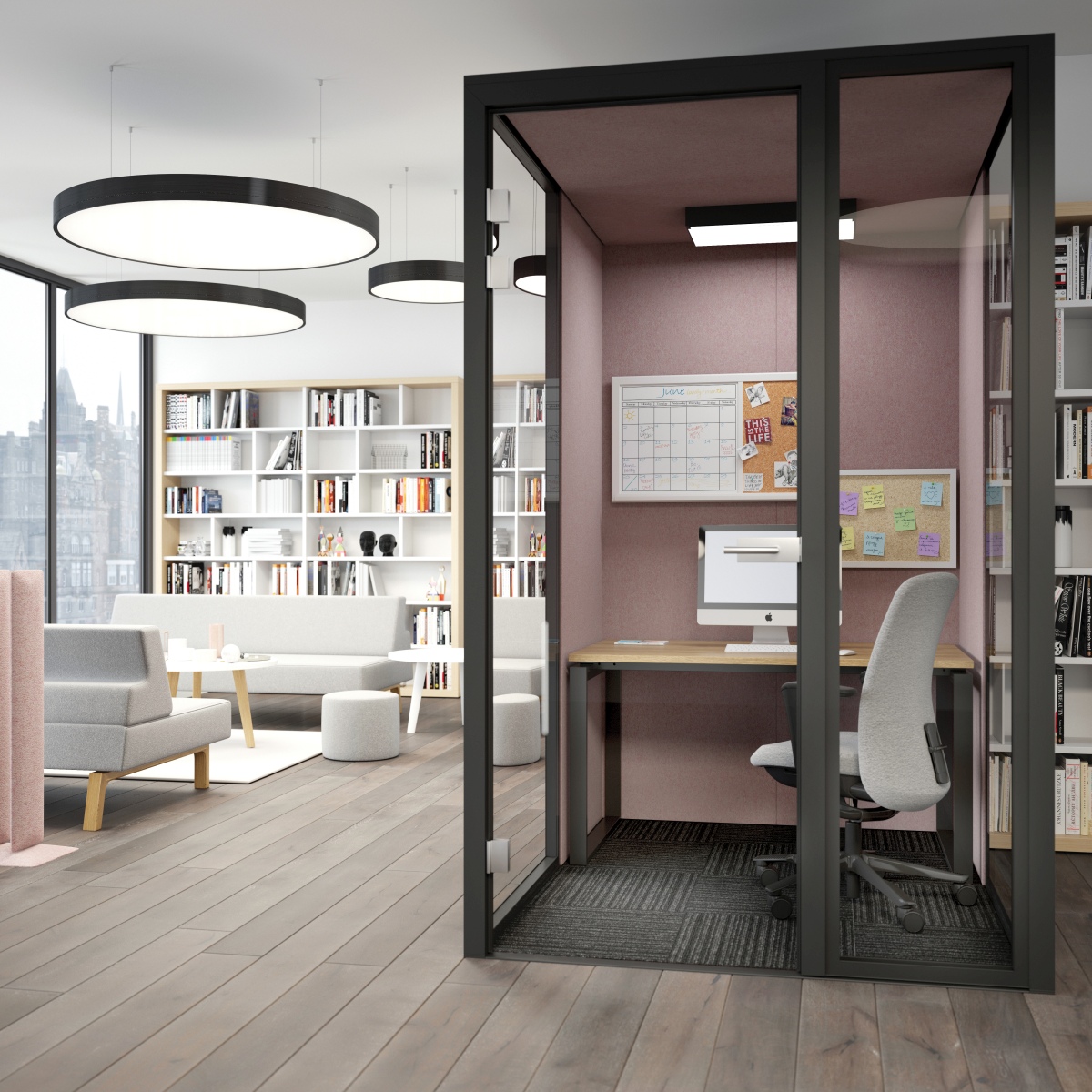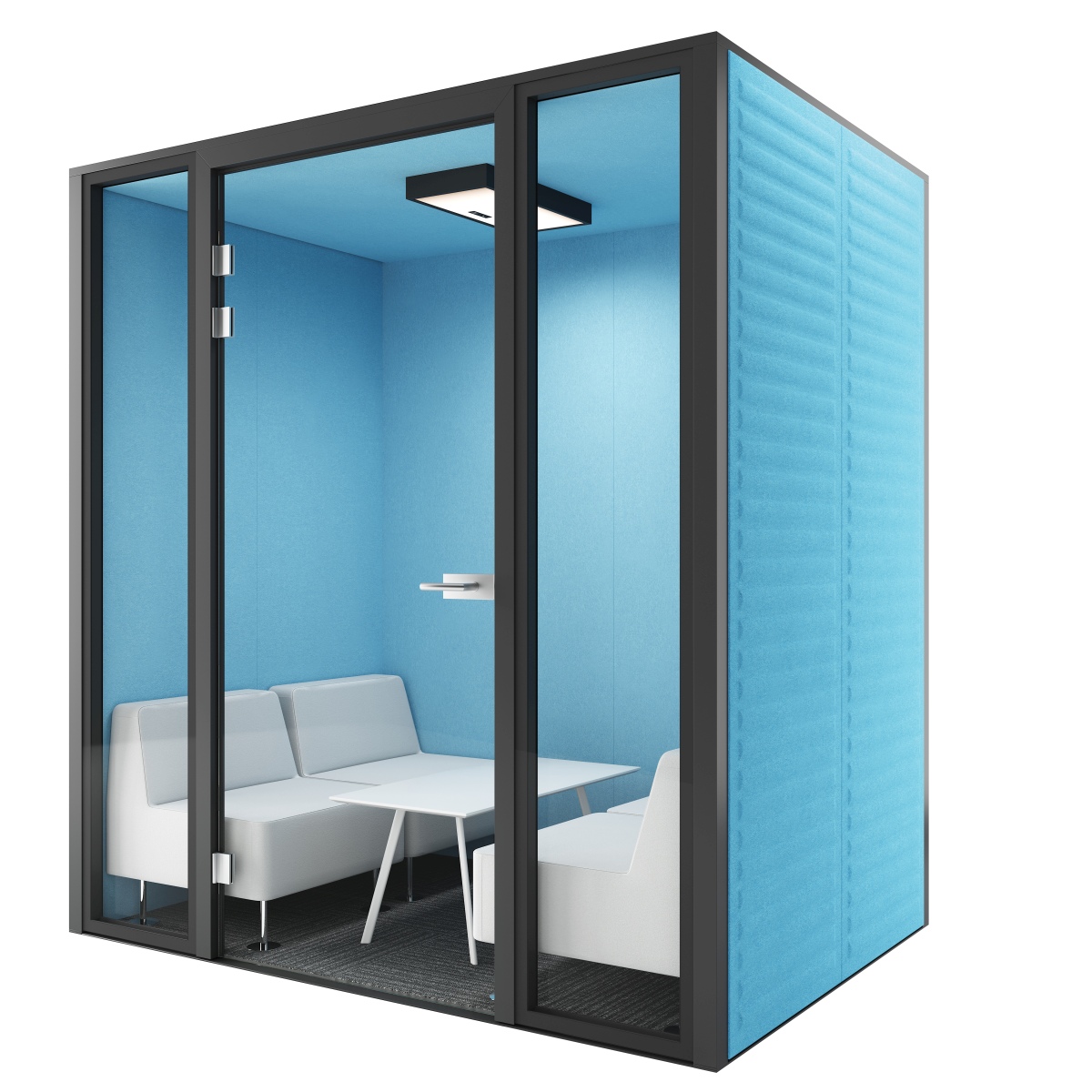 Silent Cube acoustic rooms offer many possibilities of use. There are three main groups of acoustic rooms offering different functions: - Phone Booth – designed for phone calls, video conferences or short working sessions.  Inside space of 100 x 100 cm is larger than in most phone booths available on the market and allows to use ergonomic chair inside for extra comfort. Phone Booth modules are equipped as standard with power and media solutions and a height regulated desktop to switch for sitting or standing position. - Meeting Pod – designed to host meetings of 4 or 6 people. Meeting pods are equipped as standard with power and media solutions and can additionally fitted with TV units or monitors for comfortable presentations and video conferences. - Focus Room – designed for working sessions which require concentration. A large glass wall helps to get daylight into the booth and upholstered wall panels ensure perfect sound proofing to make focused work sessions as comfortable as possible. Large space inside can be fitted with height adjustable desks and ergonomic chairs for extra comfort. We recommend desks which are 140 cm wide from our Lift, Pluris, Tundra or P-Square/P-Round collections. Focus room modules are equipped as standard with power and media solutions THE CONSTRUCTION OF SILENT CUBE ACOUSTIC ROOMS