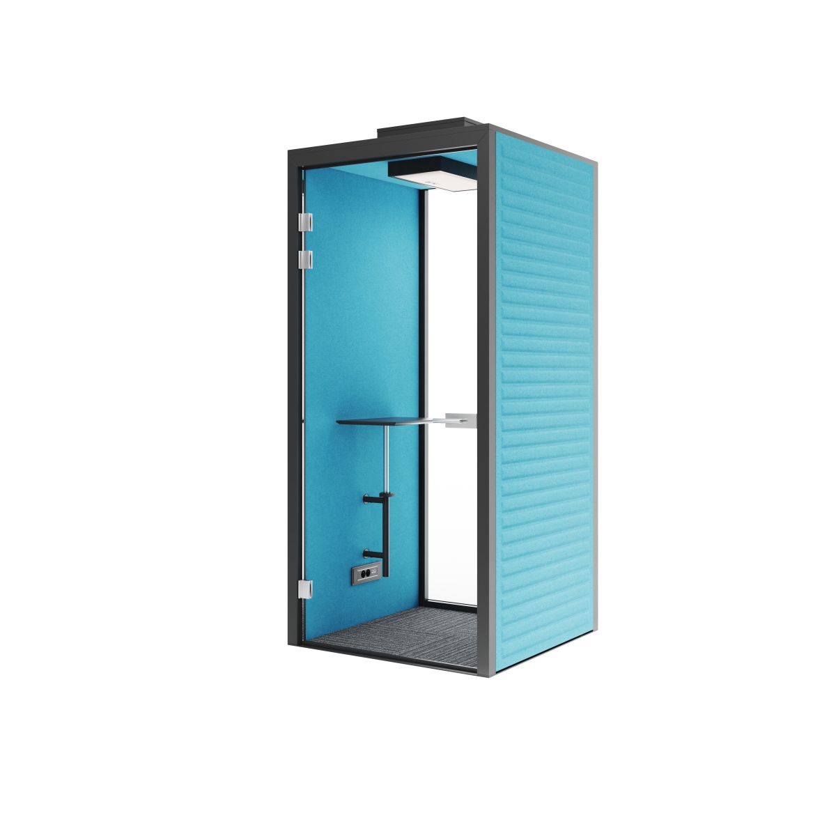 • In Phone Booths height adjustable desktops are mounted as standard.