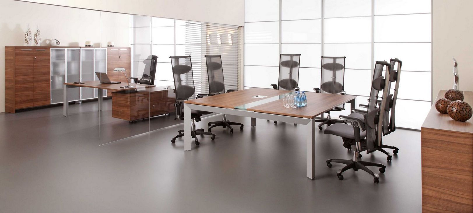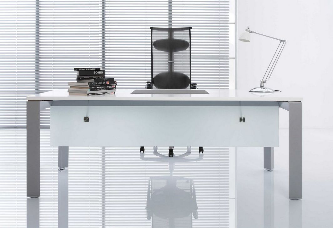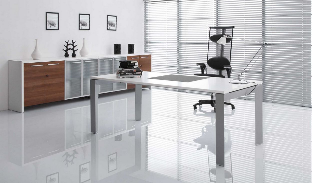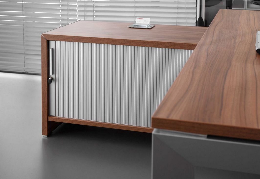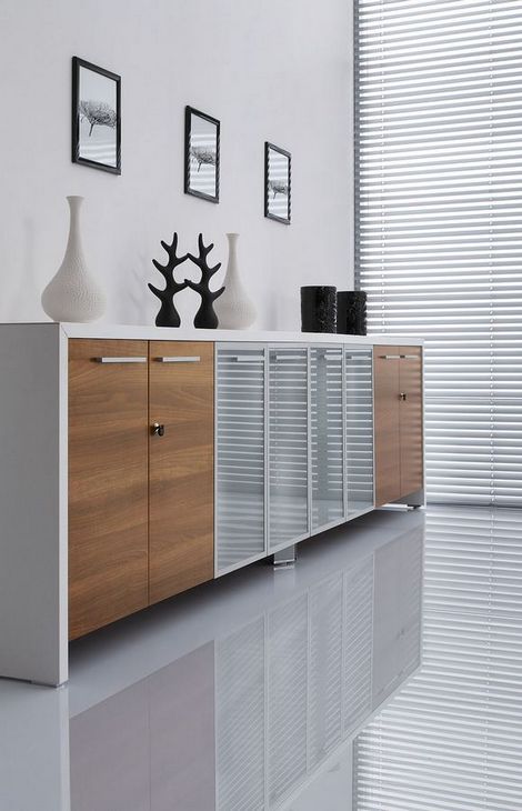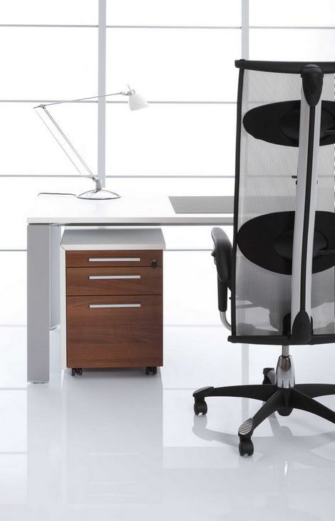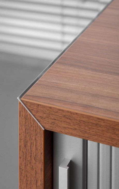 Simple form based on geometric shapes and carefully designed details are main features that emphasise the unique and modern style of TRIANGO executive furniture system. Tops of desks are supported on aluminum frames of an equilateral triangle section. Desks are available in several versions: as free standing units or with a connected handy tambour door storage unit. Desks can be equipped with a modesty panel made of matt cut glass. Cabinets with a characteristic asymmetric casing are a supplement of the TRIANGO system.